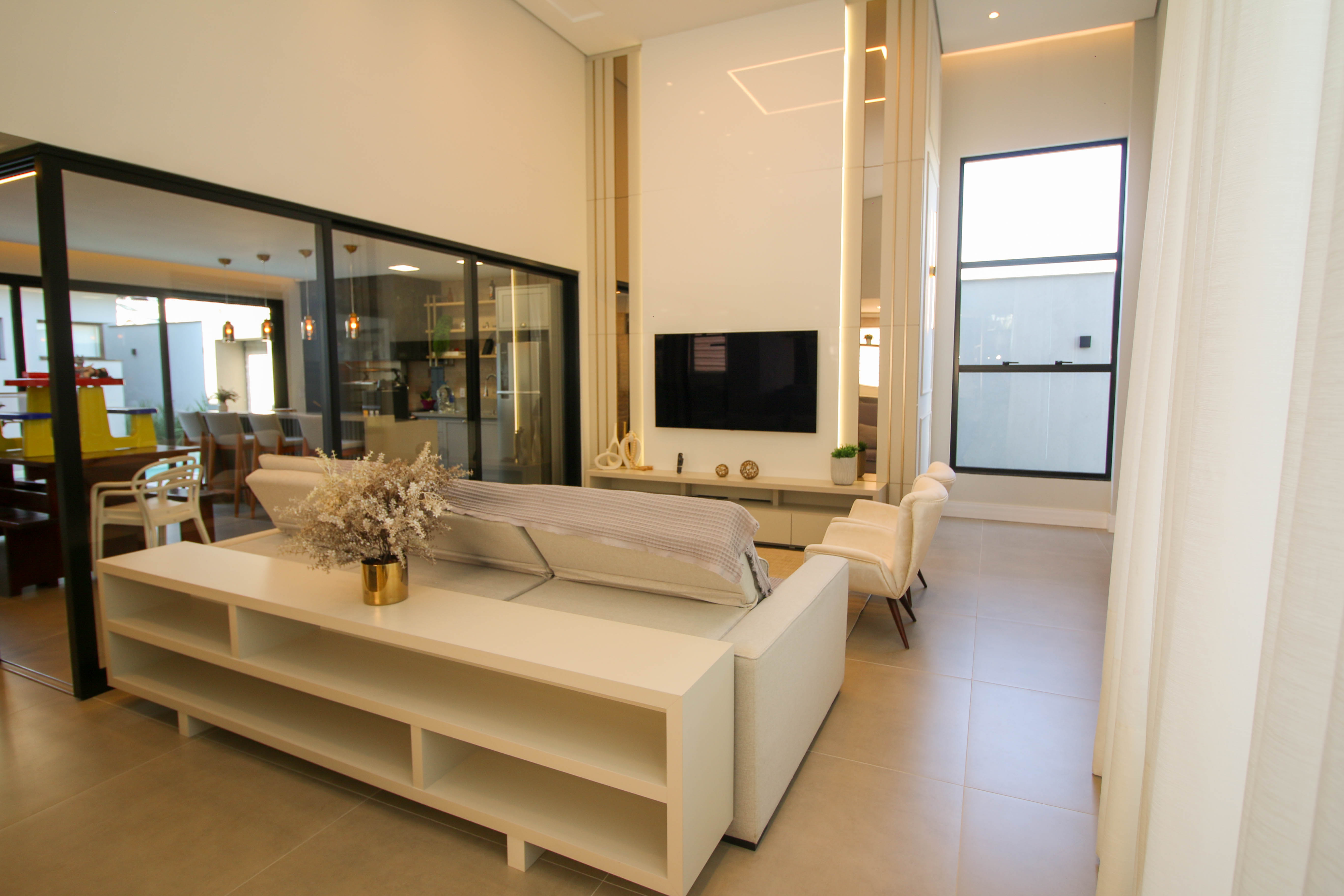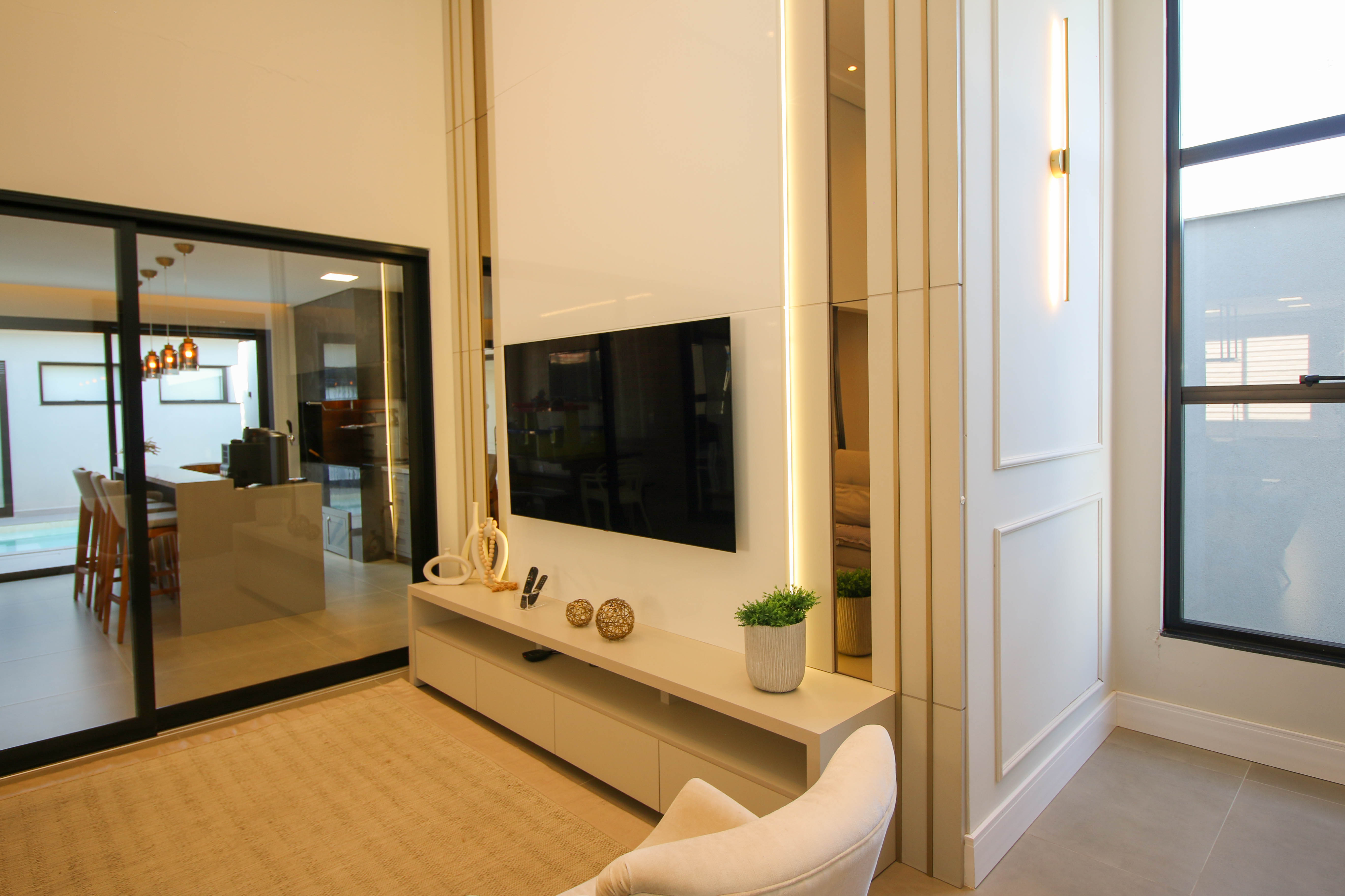 Design exclusivo em um painel planejado que valoriza a decoração e integra tecnologia. Projeto que equilibra beleza, praticidade e acolhimento para momentos especiais em família.