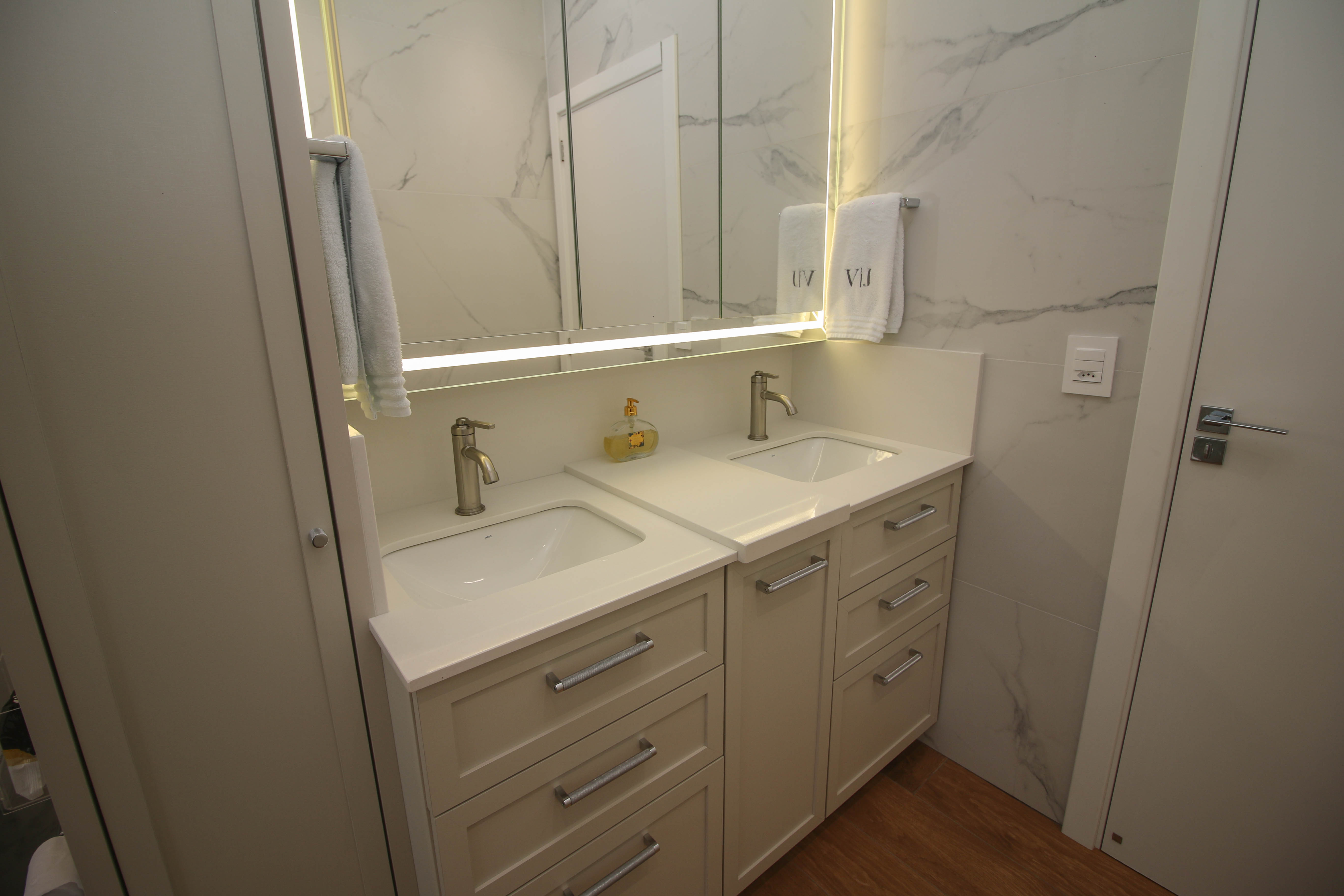 Móveis sob medida que aliam beleza e praticidade. Um projeto moderno com cuba dupla, iluminação embutida e acabamentos de alto padrão, trazendo conforto e elegância ao dia a dia.